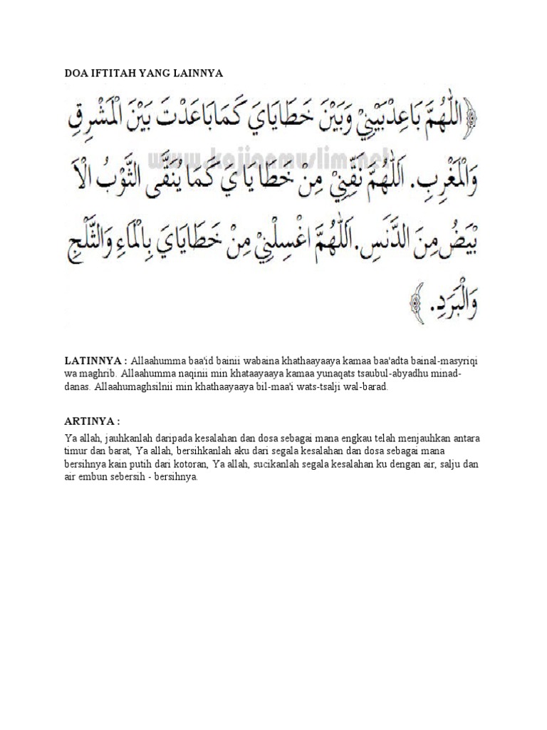 Doa iftitah latinnya. Sebagaimana sebuah penelitian yang dilakukan oleh syaikh muhammad nashiruddin al albani rahimahullah terhadap dalil dalil mengenai doa istiftah. Dalam artikel ini hanya kami cantumkan 8 doa iftitah yang umumnya paling sering digunakan. Allaahummagh silnii min khathaayaaya bil maai wats tsalji.