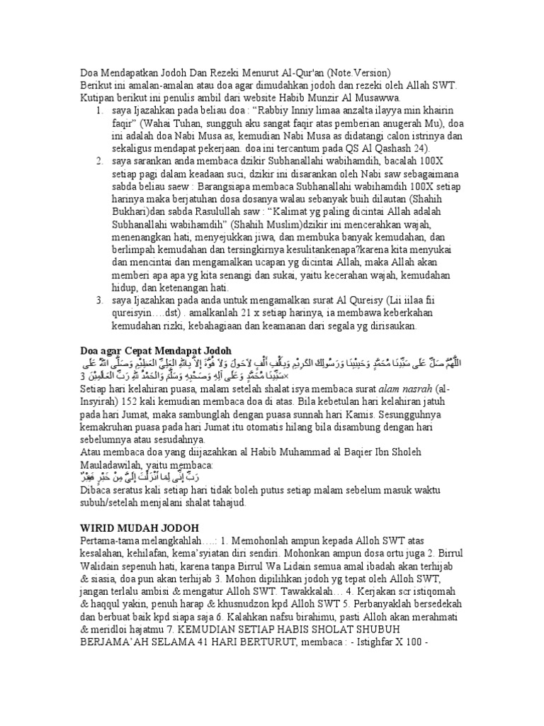 Doa jodoh dan rezeki. Semoga dengan kerja keras yang kita lakukan disertai dengan munajat doa alloh dapat mengabulkan doa kita menjauhkan kita dari segala macam kesulitan dan kemiskinan. Cara yang boleh dilakukan adalah dengan taubat dan cuba untuk menjadi individu yang lebih baik maka insyaallah anda akan mudah untuk mendapatkan apa yang diingini. Kadang punca susah mendapatkan jodoh dan rezeki adalah kerana disebabkan dosa daripada masa lalu.