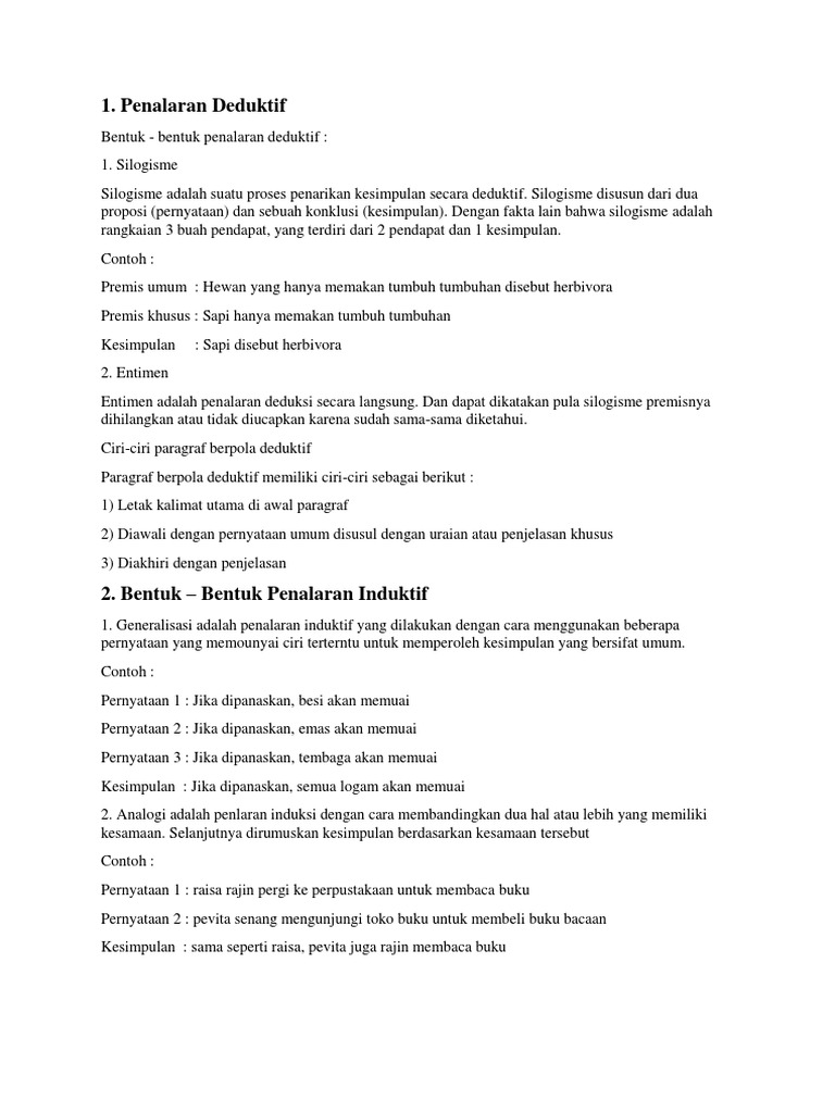 Penalaran deduktif dan induktif oct.09, 2009 in bahasa indonesia 1 penalaran adalah proses berpikir yang bertolak dari pengamatan indera (observasi empirik) yang menghasilkan… Penalaran deduktif adalah proses penalaran untuk manarik kesimpulan berupa prinsip atau. Pengertian dan penjelasan penalaran induktif. Homemapelbahasa indonesiaparagraf deduktif dan induktif: Paragraf adalah rangkaian kalimat yang saling memiliki keterkaitan dan membentuk kesatuan gagasan yang terdiri dari ide pokok dan kalimat penjelas. Induktif adalah penalaran yaitu menggunakan data spesifik untuk membentuk kesimpulan yang lebih besar dan umum. Penalaran induktif, atau induksi, adalah penalaran dari kasus atau kasus tertentu dan mendapatkan peraturan umum. Sementara, induksi matematika digunakan untuk contoh soal dan pembahasan penerapan induksi matematika. Metode induktif dan metode deduktif adalah dua pendekatan yang bertentangan untuk penelitian. Kata semua dalam kalimat tersebut dinamakan dengan pembilang. Penalaran dapat dibagi menjadi dua kategori: Kemarin, mia berangkat kerja pukul 07.15 dan tiba di tempat kerja tepat waktu. Buah mangga berwarna hijau dan rasanya manis.