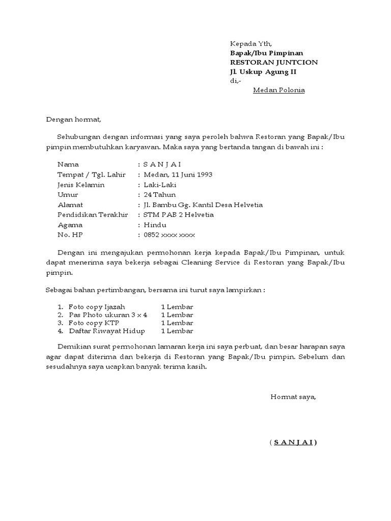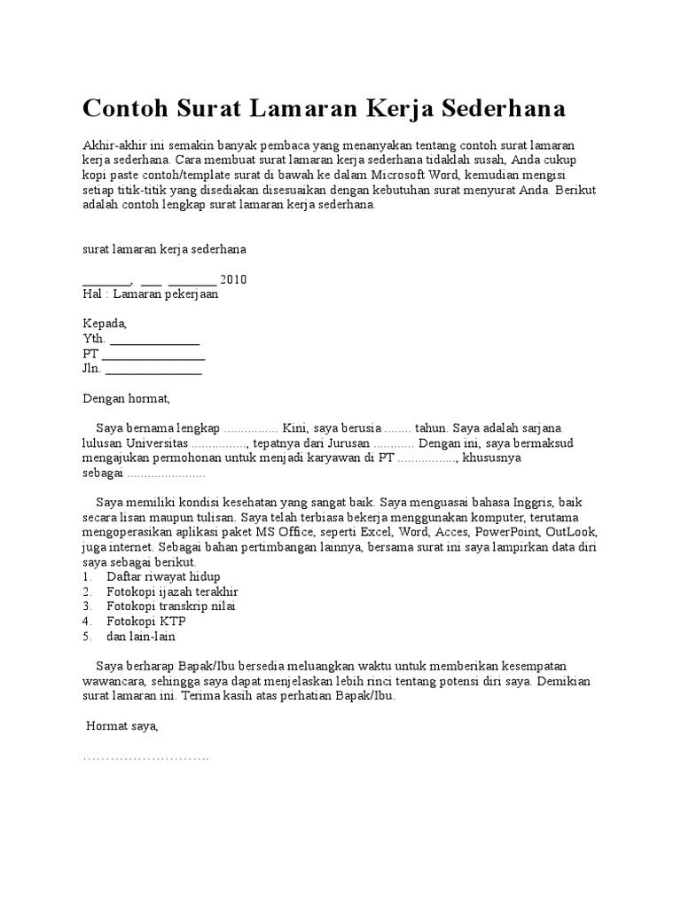 Dan berikut ini akan saya berikan beberapa contoh surat lamaran kerja yang mungkin anda butuhkan untuk melamar pekerjaan pada instansi tertentu. 1.contoh surat lamaran kerja sederhana. Daftar isi hide 18 contoh surat lamaran kerja terbaru dan lengkap dengan berbagai jenisnya 8. Surat lamaran kerja sederhana yang bikin hrd terpana. Akan tetapi, terkadang kita luput bahwa hal yang esensial bukan hanya soal ketertarikan kita pada pekerjaan yang dilamar. Mengenai surat lamaran kerja, memanglah penting bagi kamu para calon karyawan atau kamu yang ingin resign dan ingin pindah pekerjaan ke pekerjaan yang lainnya, maupun fresh graduate. Surat lamaran kerja yang baik dan benar juga sangat penting karena surat pertama yang akan dibuka saat melamar pekerjaan diperusahaan. Surat lamaran kerja adalah dokumen yang digunakan oleh pencari kerja untuk memberikan informasi tertulis kepada perusahaan yang membuka lowongan kerja. Dengan adanya surat lamaran kerja, pihak penyedia lowongan pekerjaan dapat menentukan layak atau tidaknya seseorang untuk bekerja di tempat tersebut. Terdapat beberapa instansi atau perusahaan yang justru malah tidak menyukai surat lamaran pekerjaan yang tidak to the point. Baik untuk anda yang baru saja lulus kuliah. Contoh surat lamaran kerja yang baik dan benar. Dalam membuat lamaran pekerjaan berikut adalah struktur yang perlu ditulis di dalamnya contoh pertama yaitu contoh surat lamaran pekerjaan sederhana untuk bekerja di pt yang baik dan benar sesuai dengan puebi.