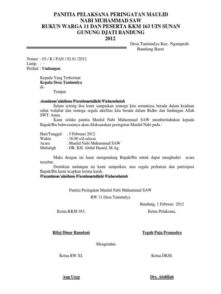 Contoh surat rekomendasi kepala desa keuchik untuk permohonan bantuan rumah layak huni surat rekomendasi adalah surat resmi yang dikeluarkan oleh kepala desa keuchik untuk membenarkan sesuatu hal atau tidak menaruh keberatan dan mendukung. Surat undangan resmi merupakan surat undangan yang dibuat oleh instansi atau perusahaan untuk kegiatan yang formal seperti undangan rapat setelah anda tahu tentang seluk beluk surat undangan, berikut kami lampirkan kepada anda beberpa contoh surat undangan yang dapat anda. Contoh surat resmi pemberitahuan tentang isra mi'raj atau maulid nabi dalam bahasa sunda di lengkapi dengan contoh desain gambar surat penggunaan surat resmi untuk menyampaikan informasi yang bersifat formal seperti pemberitahuan ataupun undangan seperti halnya surat resmi. Dengan kata lain surat pengantar sering kali digunakan oleh pemerintah desa. Untuk itu disini saya akan memberikan beberapa contoh surat undangan rapat yang biasa saya buat didalam lingkup warga rt dan rw. Kamu sedang mencari contoh surat undangan acara peringatan maulid nabi muhammad dalam format doc atau word? Mungkin kebanyakan dari kita telah mengenal dengan jenis surat yang satu ini. Setelah dibahas mengenai beberapa contoh surat undangan resmi, dimulai dari surat undangan perusahaan, surat. Kepala surat yang berisi kop surat seperti biasa yang menunjukkan identitas yang mengundang pada postingan kali ini, saya ingin membagikan contoh surat undangan acara maulid nabi jangan lupa untuk subscribe, like dan bagikan videonya. Dalam memberikan informasi kita dapat melakukannya dengan lisan maupun tertulis.penyampaian informasi secara lisan dapat dilakukan saat berhadapan langsung, sedangkan penyampaian informasi secara tertulis dapat dilakukan dengan melalui surat. Contoh surat undangan maulid nabi. Namun, untuk membuat sebuah surat undangan yang baik, dibutuhkan contoh surat undangan pernikahan paling lengkap. Surat undangan terbagi menjadi dua macam yaitu surat undangan resmi dan surat undangan non resmi.